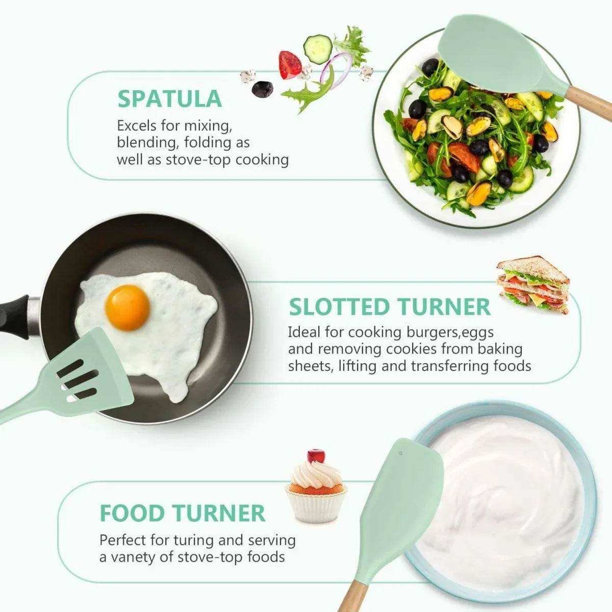 Silicone cookware set. Our cookware kit is designed with high quality, sturdy silicone heads that are firmly attached to their natural wood handles to keep you cooking for years. Our non-toxic, BPA-free cookware set always looks and feels like you expect. This set includes: