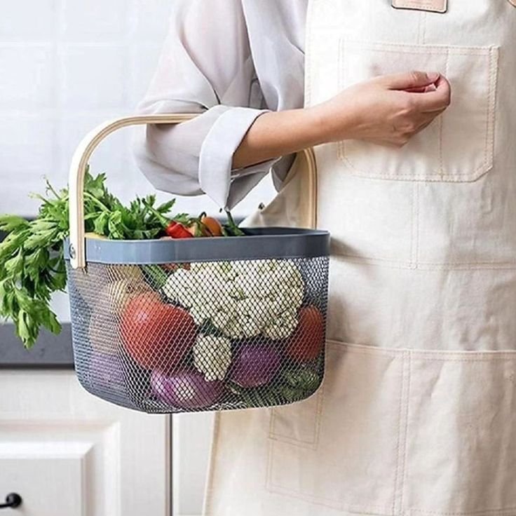 Keep your kitchen organized and stylish with this multi-functional metal storage basket with wooden handle. Designed with durable wire mesh and a sturdy frame, it provides excellent ventilation to keep fruits and vegetables fresh while adding modern décor to your kitchen.