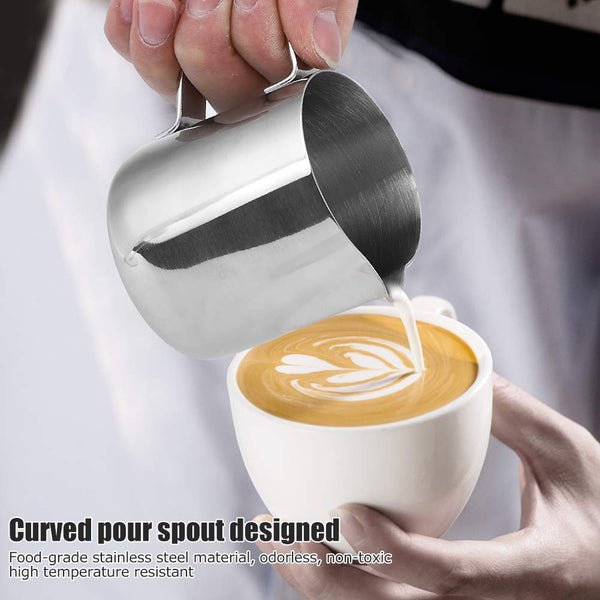 This 350ML Stainless Steel Milk Frothing Pitcher is designed for making smooth milk foam for latte, cappuccino, mocha, and hot chocolate. The strong stainless steel body makes it durable, rust-resistant, and easy to clean.